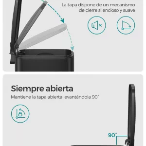 Cierre Lento y Apertura Constante: La tapa se cierra de manera suave y silenciosa, evitando ruidos molestos. También cuenta con la opción de mantener la tapa abierta, lo que facilita la eliminación continua de residuos cuando sea necesario.