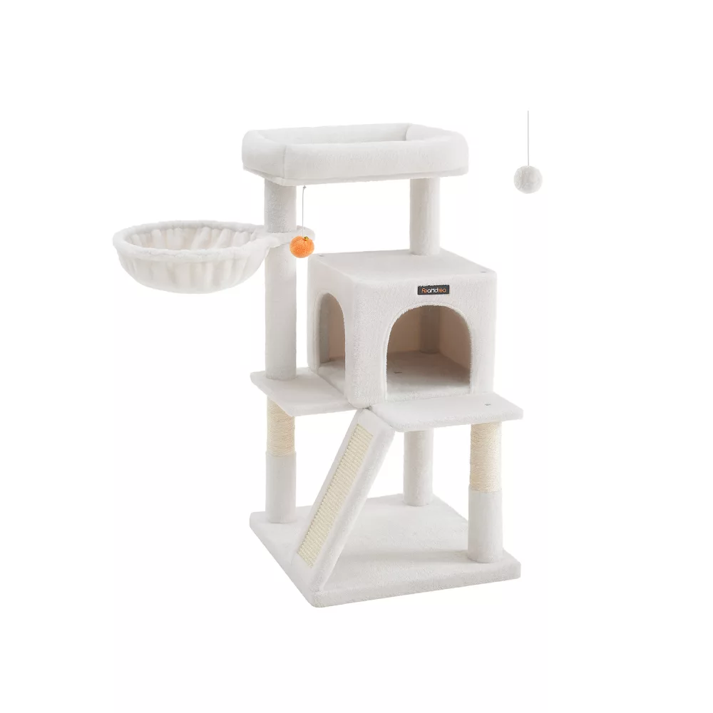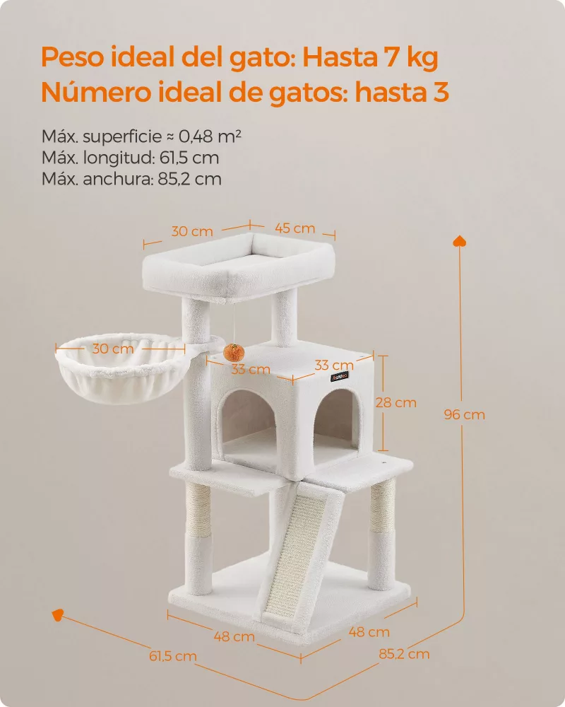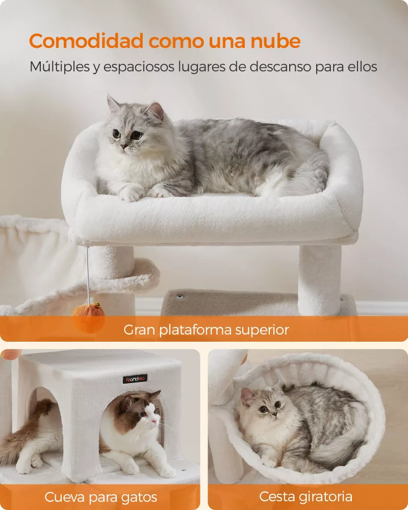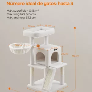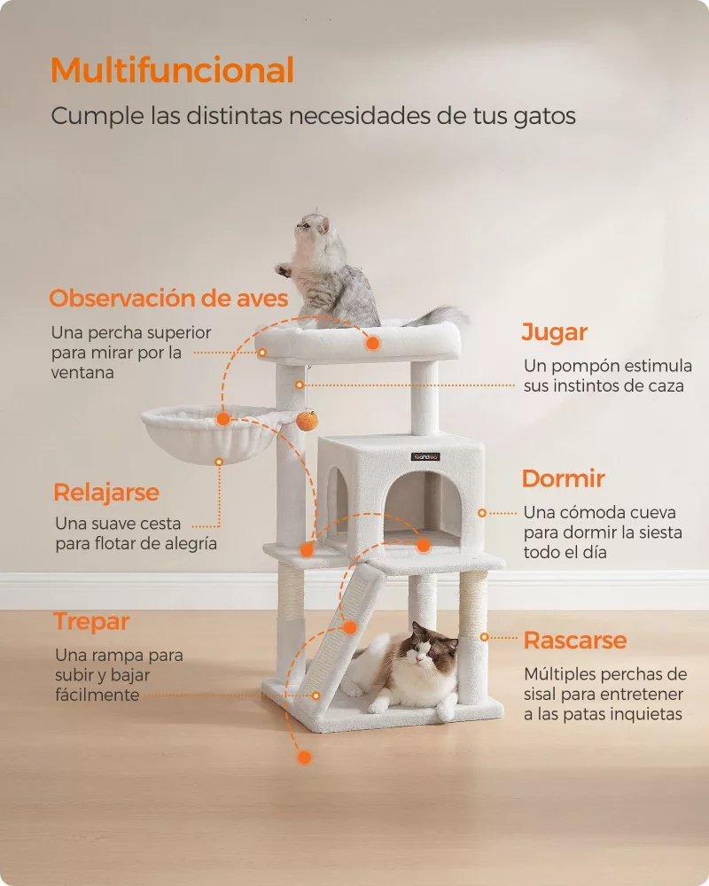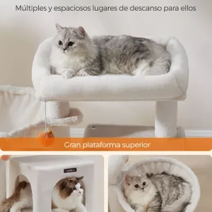 Rampa de Rascado 2 en 1: Este árbol para gatos incluye una práctica rampa que funciona tanto como tablero de rascado como escalera. Esto facilita el acceso para gatitos, gatos mayores o aquellos con problemas de movilidad, mientras satisface su necesidad de rascar.