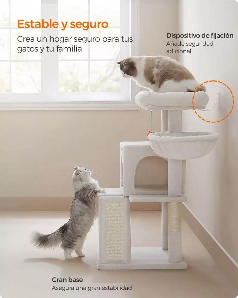 Material Robusto, Zona de Juegos Segura: Hecho con tablero de aglomerado resistente, felpa suave y postes envueltos en sisal, este árbol para gatos es una zona de juego segura, ideal para que jueguen hasta 3 gatos (máx. de 7 kg cada uno).