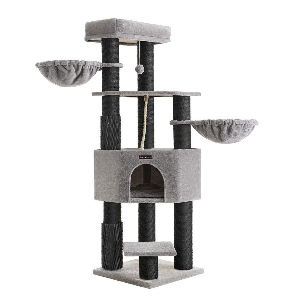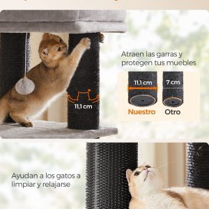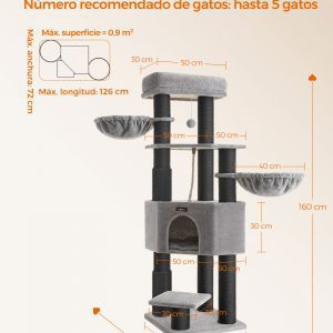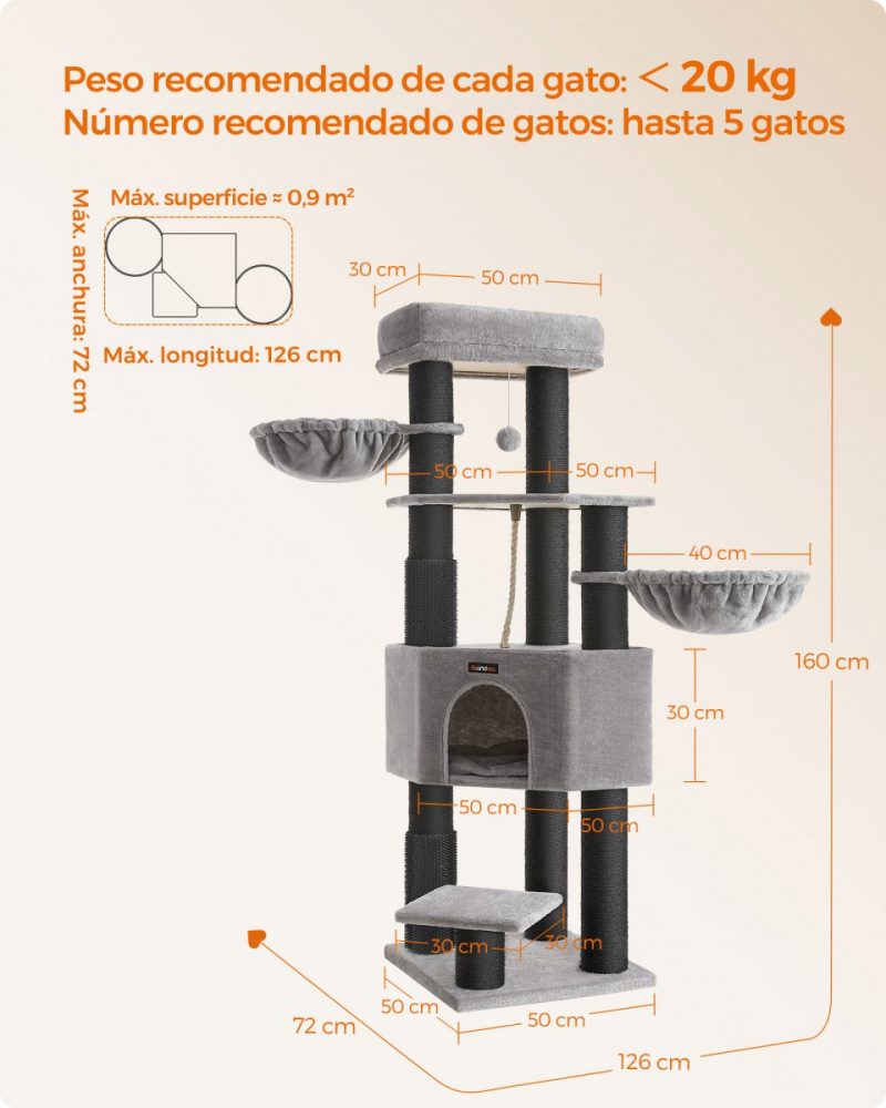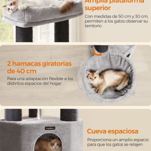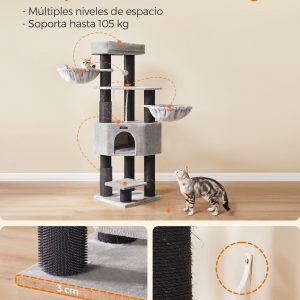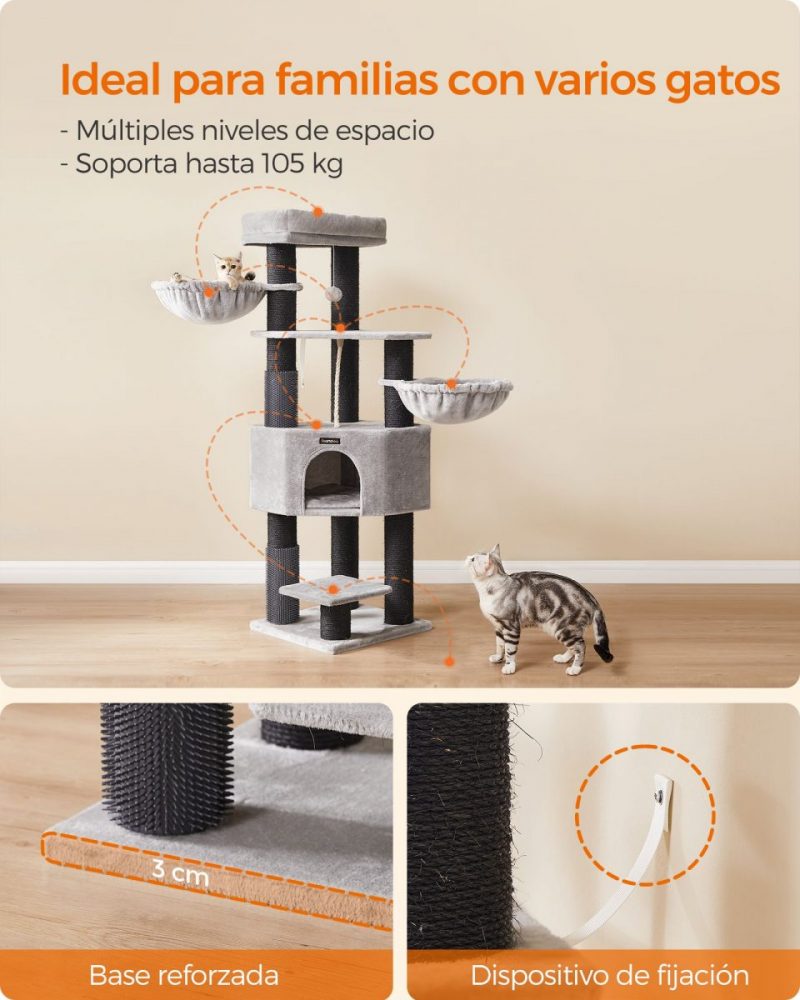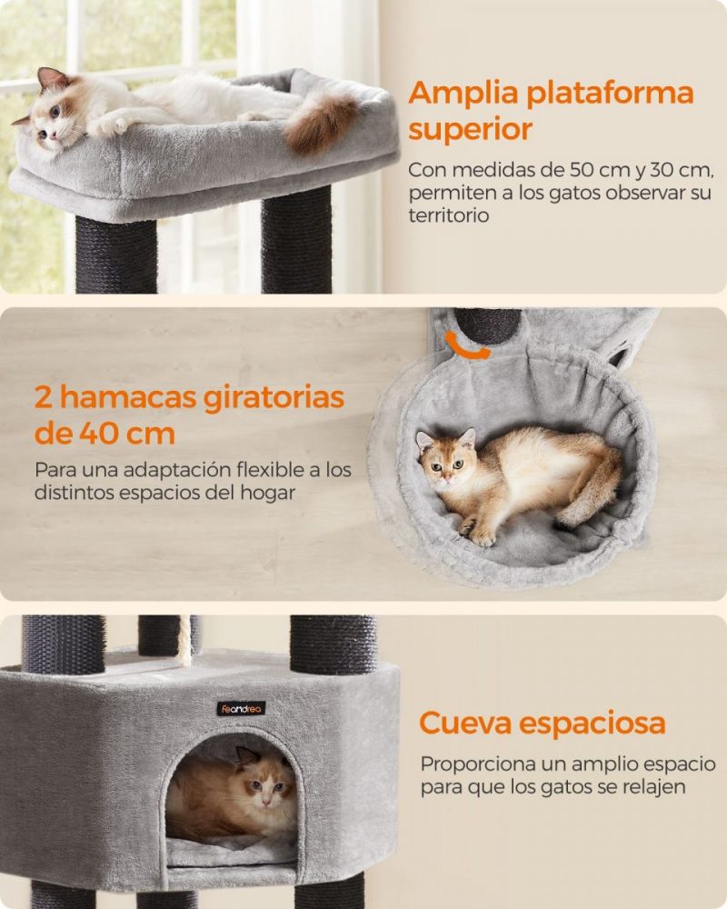 Con una base reforzada de 50 x 50 cm y postes robustos, este árbol para gatos ofrece una estabilidad inigualable, complementada con un dispositivo de fijación para asegurar el mueble a la pared. Además, cuenta con una cueva espaciosa, dos hamacas grandes, y una plataforma superior amplia, haciéndolo ideal incluso para razas grandes como Ragdoll y Maine Coon.