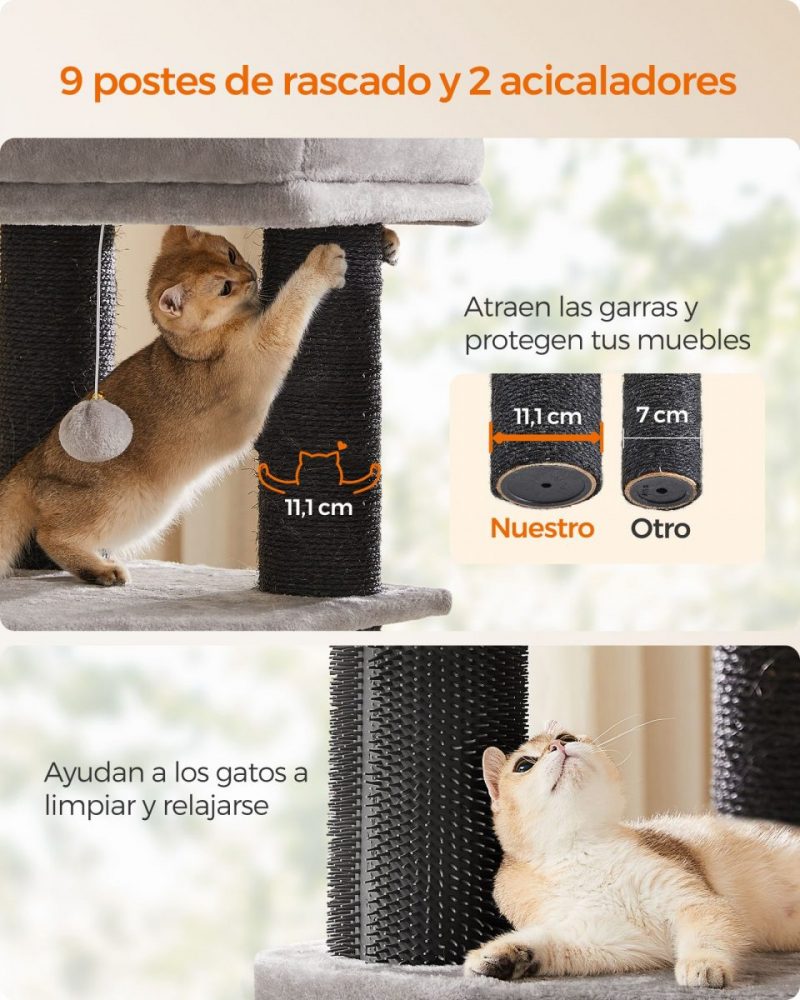 Además, hemos integrado cepillos de auto-aseo en dos postes, ofreciendo a tus gatos la oportunidad de cuidar su pelaje mientras disfrutan de un masaje gratificante, todo ello mientras te liberas de algunas tareas de aseo.