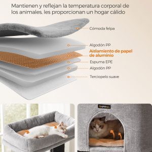 Las almohadillas autocalentables ubicadas en la plataforma superior y dentro de la cueva, utilizan el calor corporal de tu gato para crear un refugio cálido y acogedor. Este sistema inteligente de retención de calor asegura que tu mascota disfrute del confort máximo durante las frías noches o días de invierno.