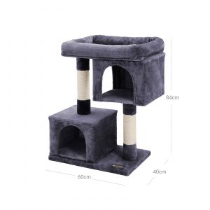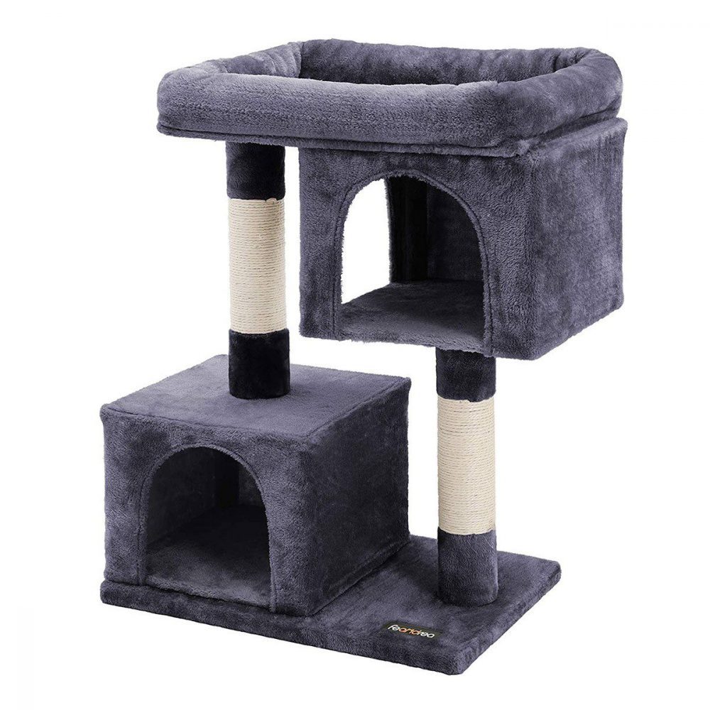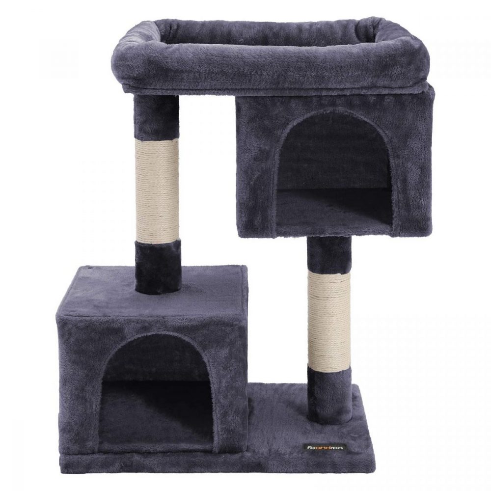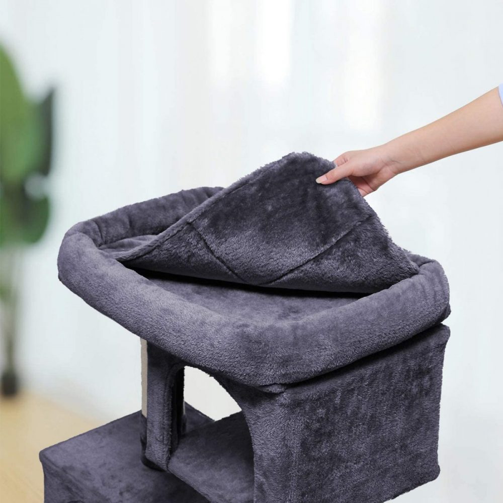 El árbol incluye dos casetas de juego, creando escondites perfectos y lugares acogedores para dormir. Es ideal para gatos activos que disfrutan de tener su propio espacio privado.