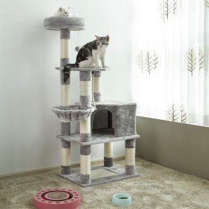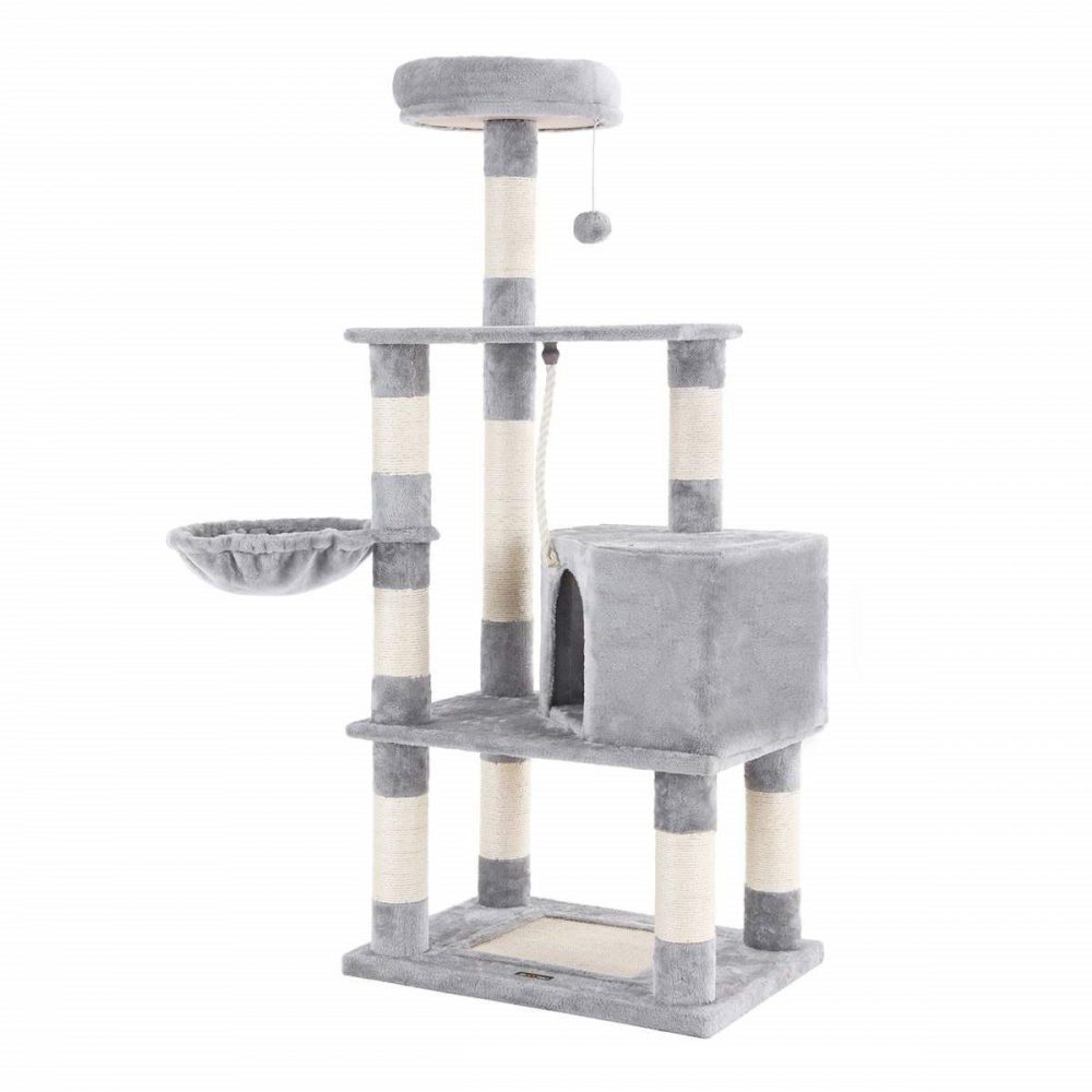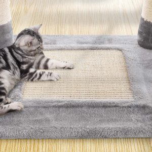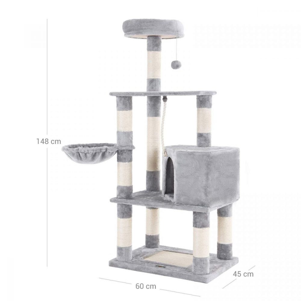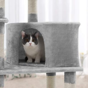 Árbol rascador para gatos gris claro, caseta y postes de sisal