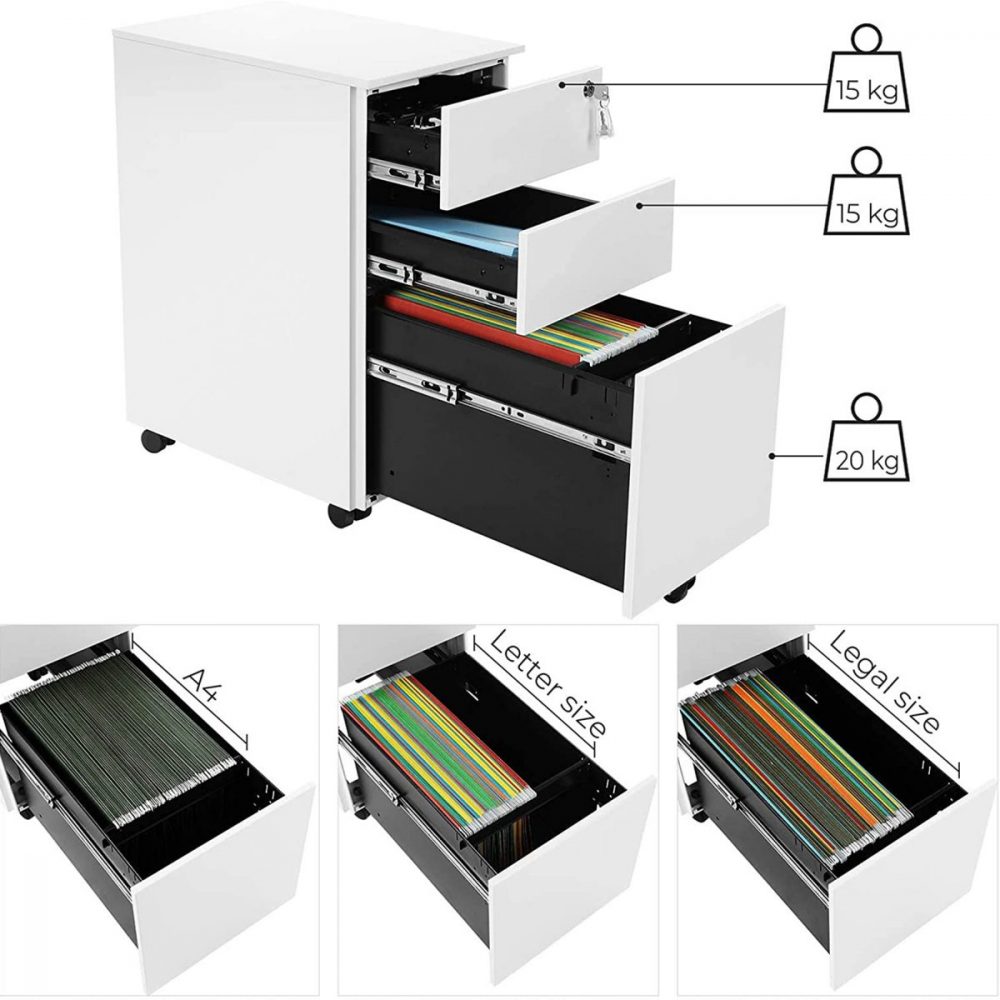 Robusta Durabilidad: Fabricado con una estructura de acero de alta calidad, este archivador garantiza una gran durabilidad. Los dos cajones superiores soportan hasta 15 kg cada uno, mientras que el cajón inferior ofrece una capacidad máxima de 20 kg, proporcionando un almacenamiento seguro y estable para todos tus archivos.