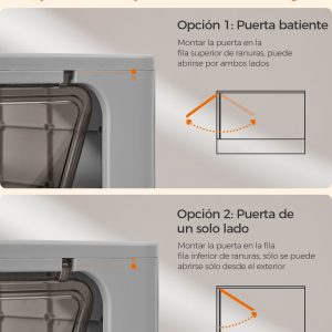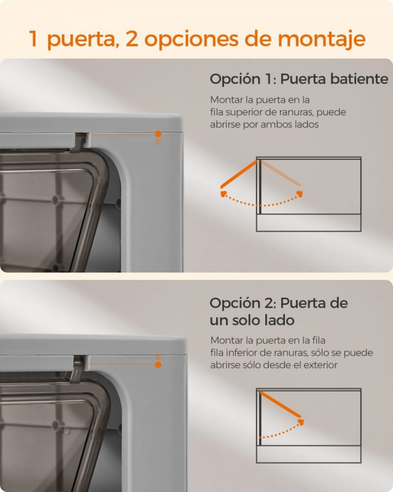 La puerta de esta caja de arena se puede configurar de dos maneras: como una entrada de un solo sentido con salida por la parte superior, o giratoria para un acceso libre. Esta flexibilidad permite adaptar la caja a las preferencias de tu gato, incluso permitiendo retirar la puerta para los novatos.