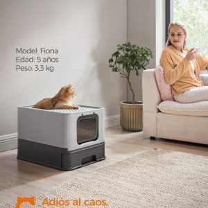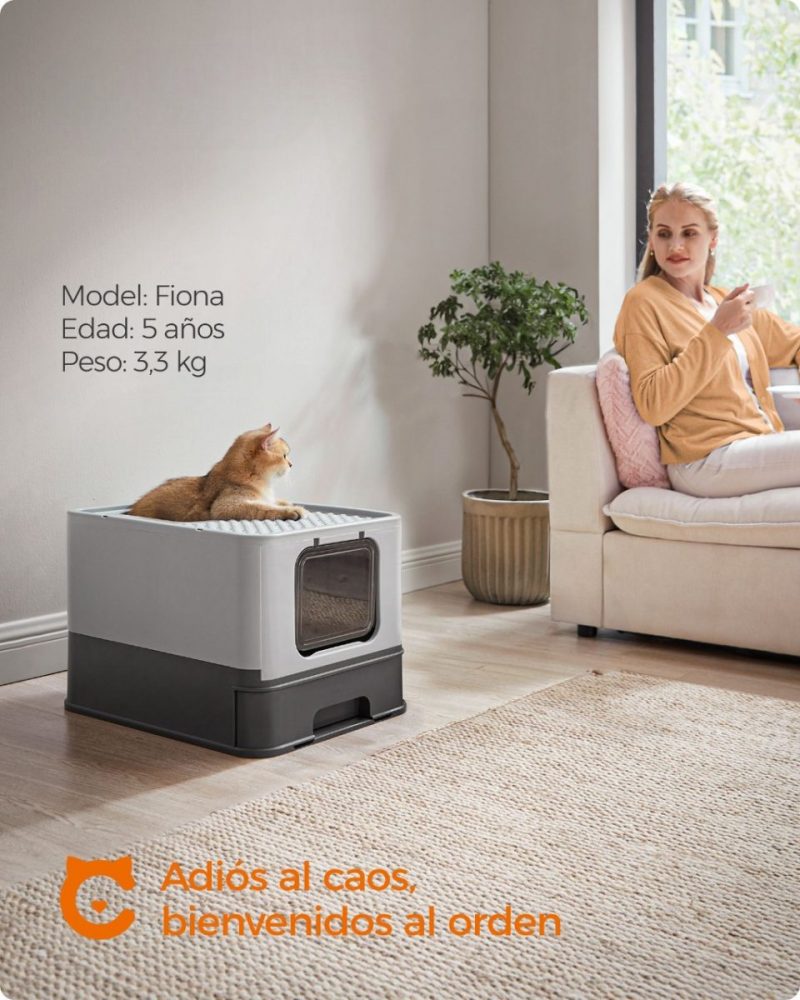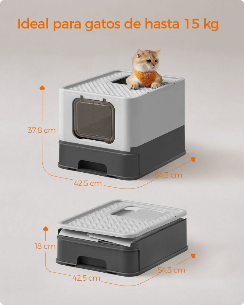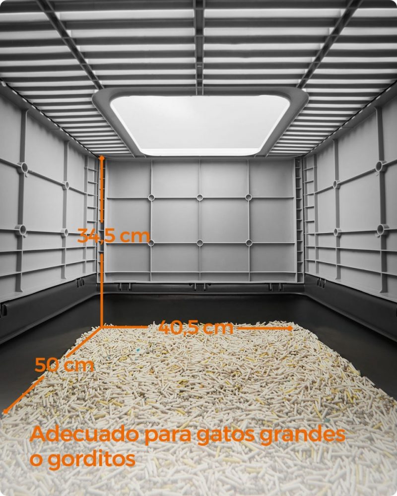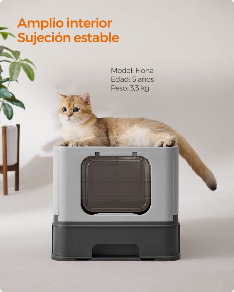 Con dimensiones interiores de 50 x 40,5 x 34,5 cm, ofrece amplio espacio para gatos de mayor tamaño, garantizando que incluso los felinos más grandes o robustos encuentren su lugar cómodo para hacer sus necesidades. La parte superior es resistente, soportando hasta 15 kg, adecuada para gatos de todos los tamaños.