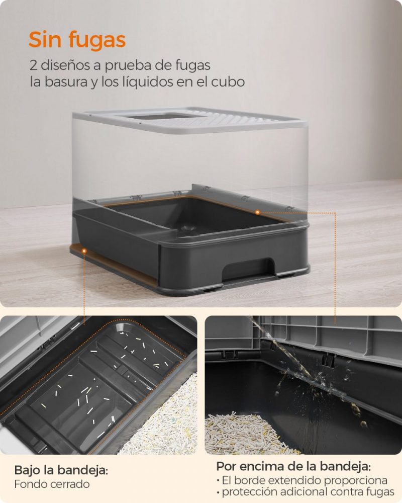 Gracias a su borde extendido y fondo cerrado, esta caja de arena asegura que todo permanezca dentro, incluso si tu gato tiene la costumbre de escarbar o hacer sus necesidades de pie. Esta característica es esencial para prevenir fugas y mantener el área alrededor de la caja de arena impecable.