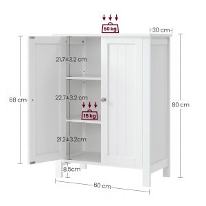 Amplio Espacio de Almacenaje: Con dimensiones de 60 x 80 x 30 cm (Largo x Ancho x Alto), este armario ofrece mucho espacio para toallas, papel higiénico y otros utensilios de baño. Las puertas opacas mantienen los objetos resguardados del polvo, el agua y miradas no deseadas.