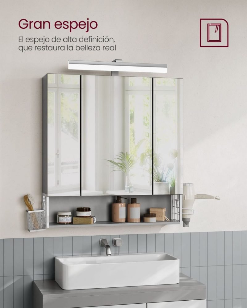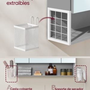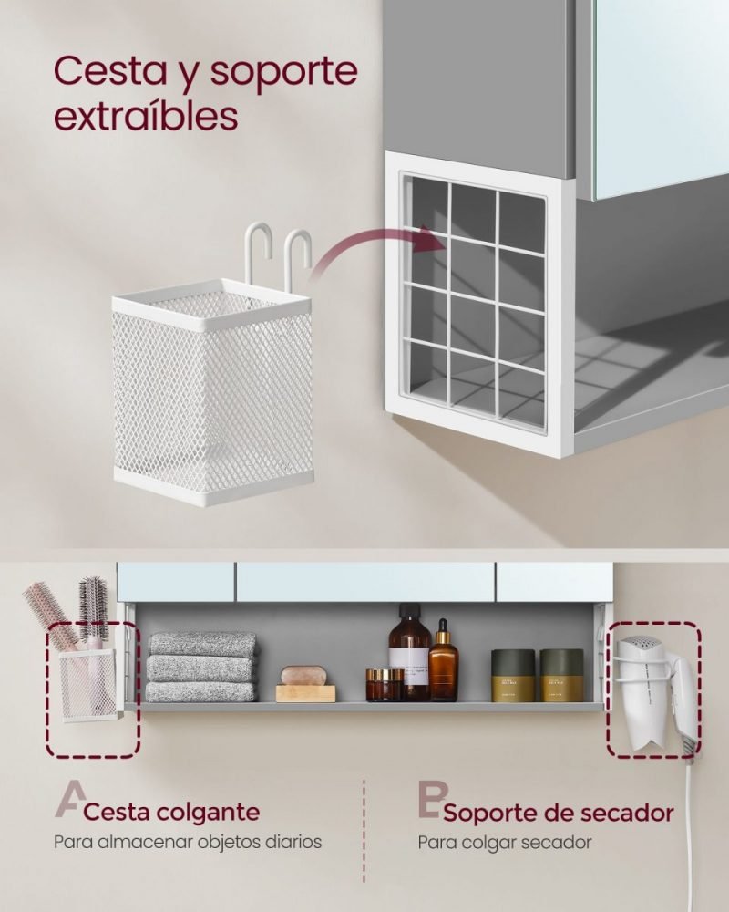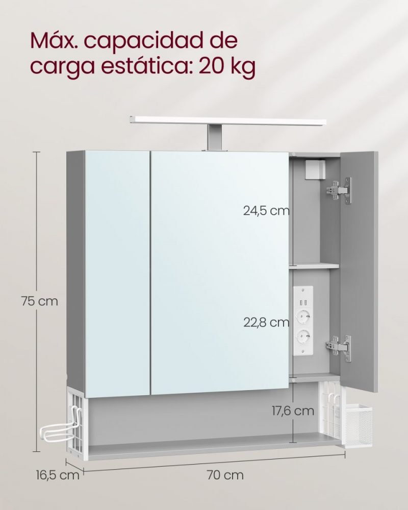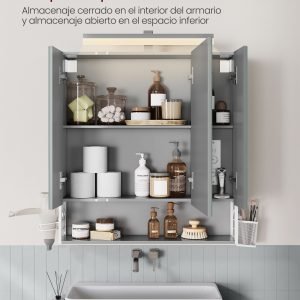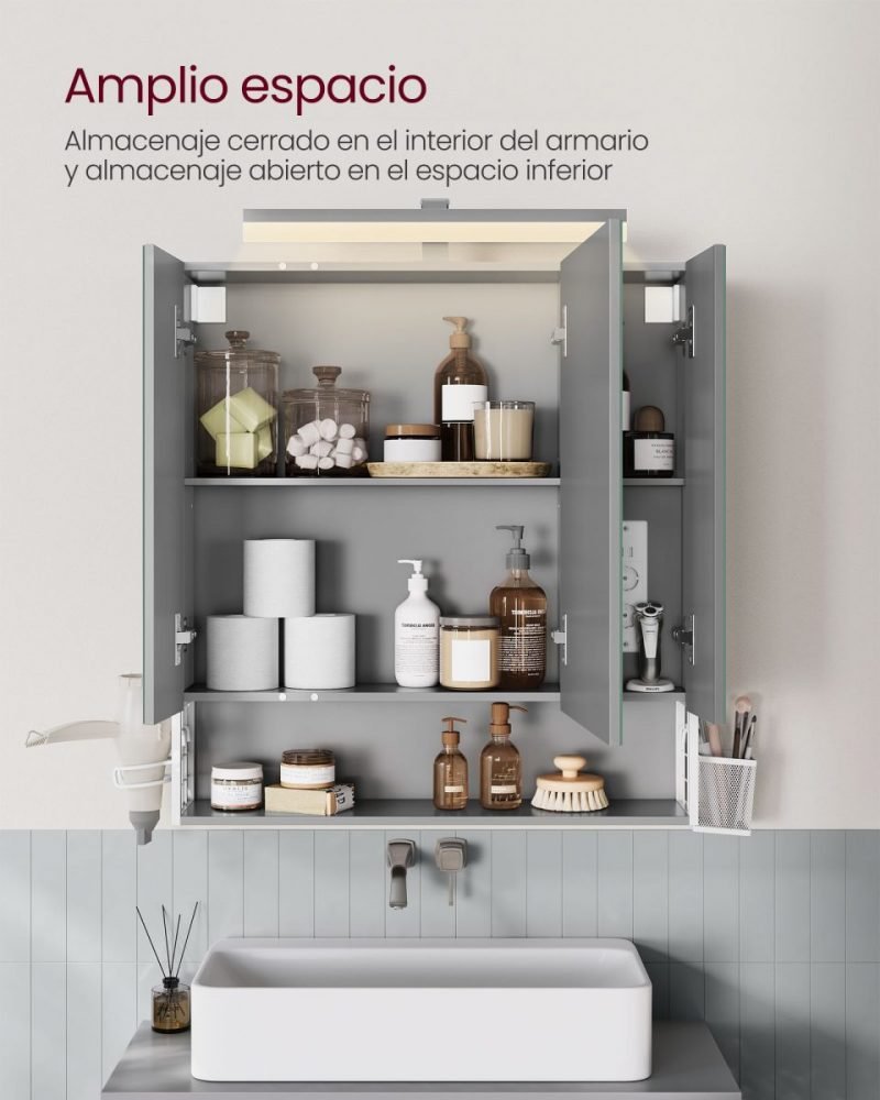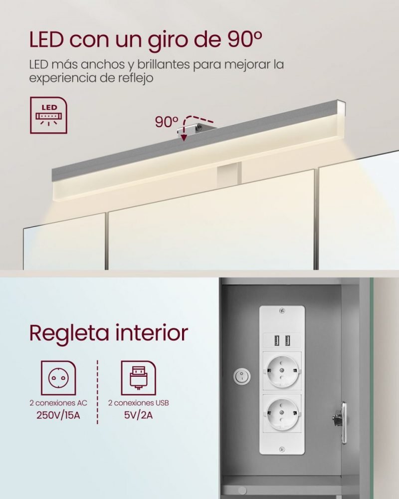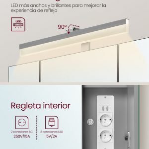 Conectividad Integrada: Dotado de dos orificios de AC y dos USB en su interior, este armario te permite cargar cepillos de dientes eléctricos y maquinillas de afeitar, manteniendo tus dispositivos listos para usar.