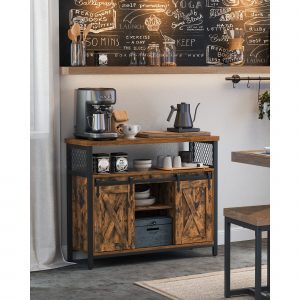 Diseñado con una combinación de resistente acero y tablero de aglomerado, este armario no solo es estilizado sino también funcional. Desde tu cafetera hasta tus platos, todo encuentra su lugar con fuerza y estilo.