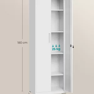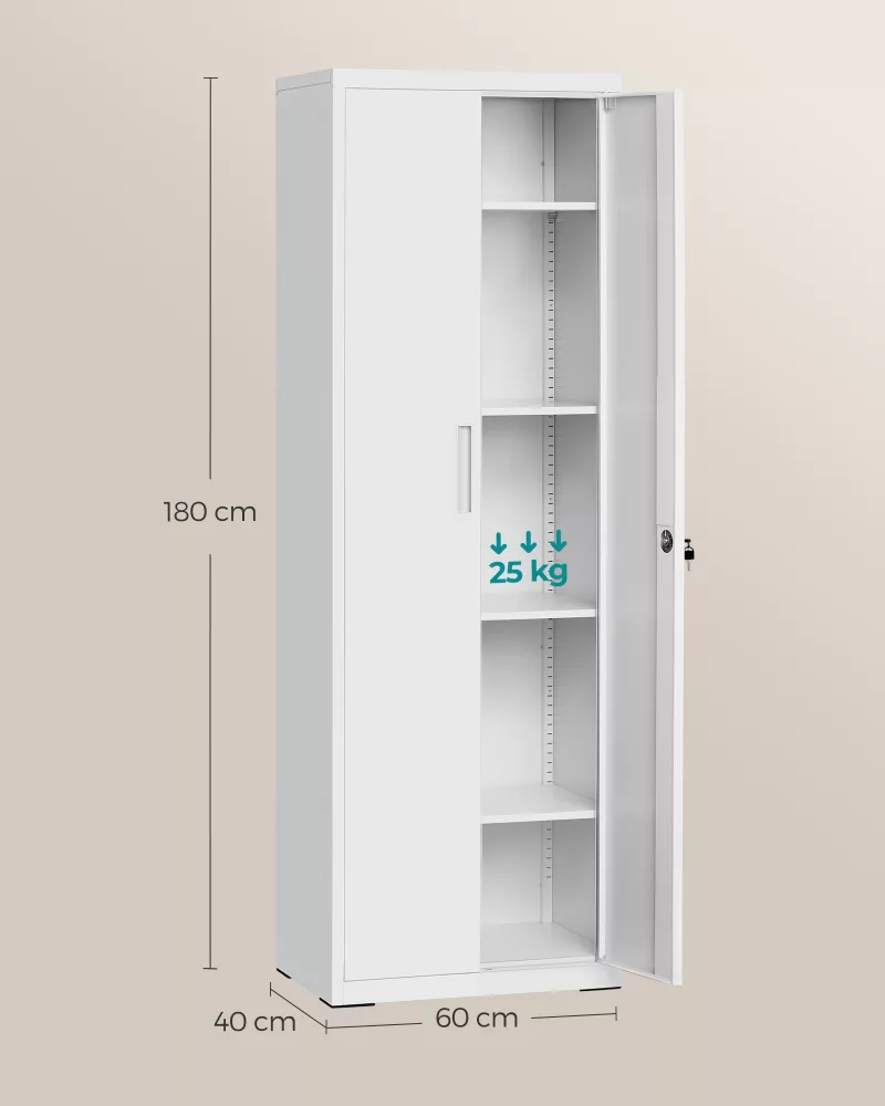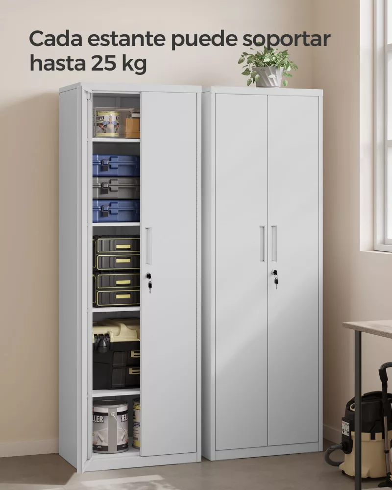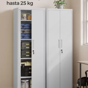 Alta capacidad de carga: Este armario alto de 40 x 60 x 180 cm está fabricado con acero de alta resistencia, permitiendo que cada balda soporte hasta 25 kg, asegurando resistencia y durabilidad a largo plazo.