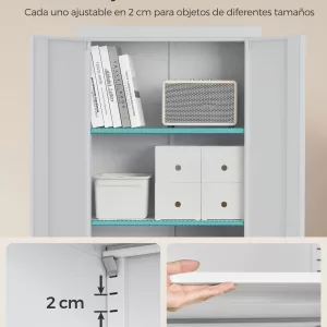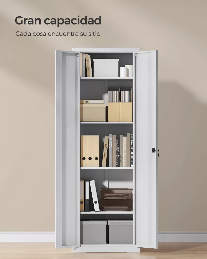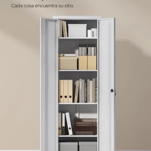 Este armario metálico está diseñado para ofrecer una solución de almacenamiento eficiente tanto en el hogar como en el entorno de trabajo. Su estructura robusta de acero recubierto de polvo garantiza durabilidad y facilidad de mantenimiento, mientras que su diseño elegante en color gris se adapta perfectamente a cualquier espacio. Ideal para organizar documentos, herramientas, libros y otros objetos, manteniendo el orden y optimizando el espacio disponible.
