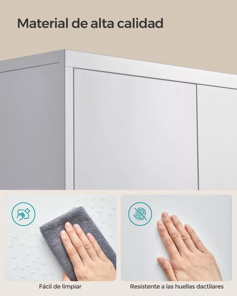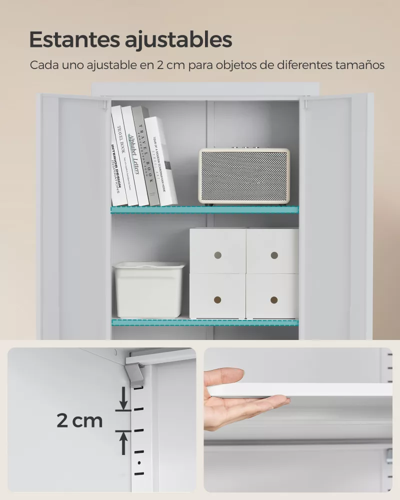 Baldas ajustables: Equipado con 4 baldas que se pueden ajustar en altura según tus necesidades, permitiendo almacenar artículos de diferentes tamaños y alturas.