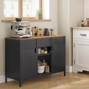 Espacio Amplio y Flexible: Dispone de una encimera espaciosa ideal para colocar una cafetera o microondas, un cajón para utensilios pequeños, 2 compartimentos abiertos y estantes ajustables en altura para organizar tus objetos de manera práctica y eficiente.