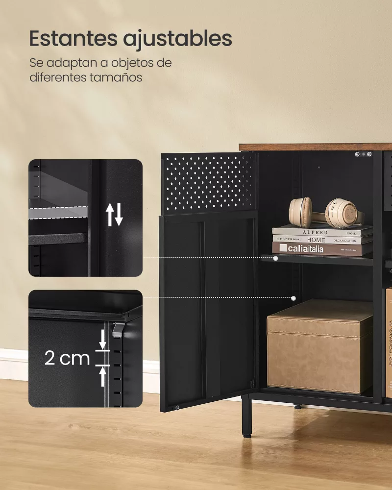 Este armario versátil, de diseño clásico y elegante, es perfecto para cualquier espacio en tu hogar. Con su amplia capacidad de almacenamiento y materiales duraderos, se adapta a tus necesidades como aparador en la cocina, mueble de TV en la sala de estar o armario de almacenamiento en la oficina.