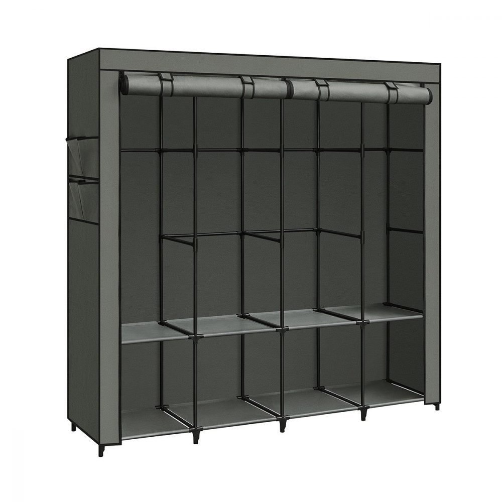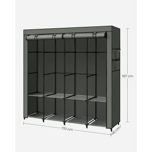 Los tubos de acero de 16 mm de diámetro y las juntas de plástico reforzado proporcionan un soporte sólido para tu ropa. Con 4 secciones para colgar y una capacidad máxima de carga estática por barra de 15 kg, este armario es ideal para mantener tu ropa organizada y sin arrugas.