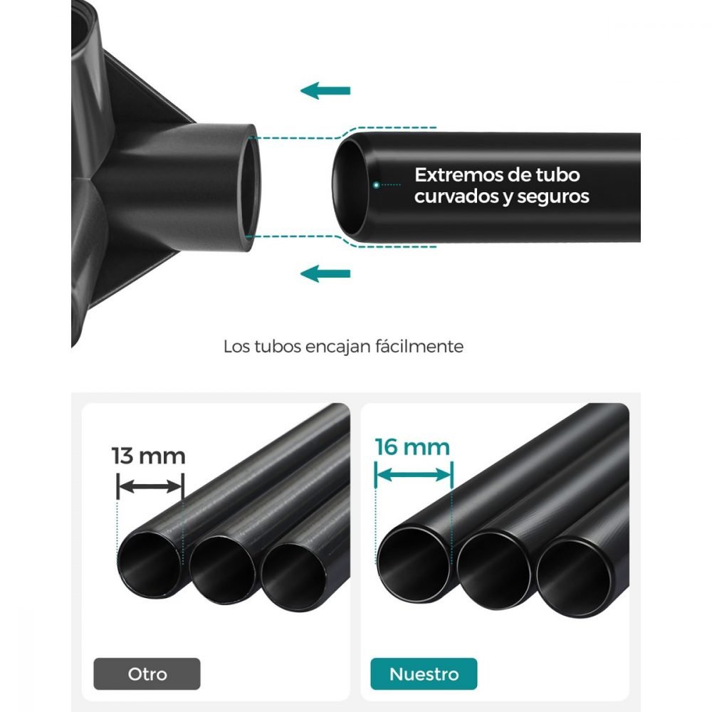 Fabricado con tubos de acero de 16 mm de diámetro y juntas de plástico reforzado, este armario ofrece un soporte sólido para tu ropa, con una máxima carga estática por barra de 15 kg.