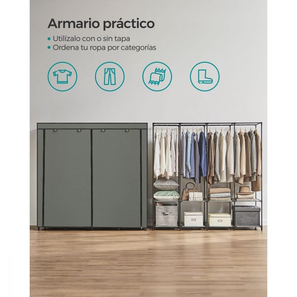 Con 4 secciones para colgar con una altura máxima de 120 cm, este armario garantiza un almacenamiento eficiente para camisas, abrigos, faldas y más. Además, cuenta con estantes para guardar zapatos o bolsos, proporcionando una solución completa para tus necesidades de almacenamiento.
