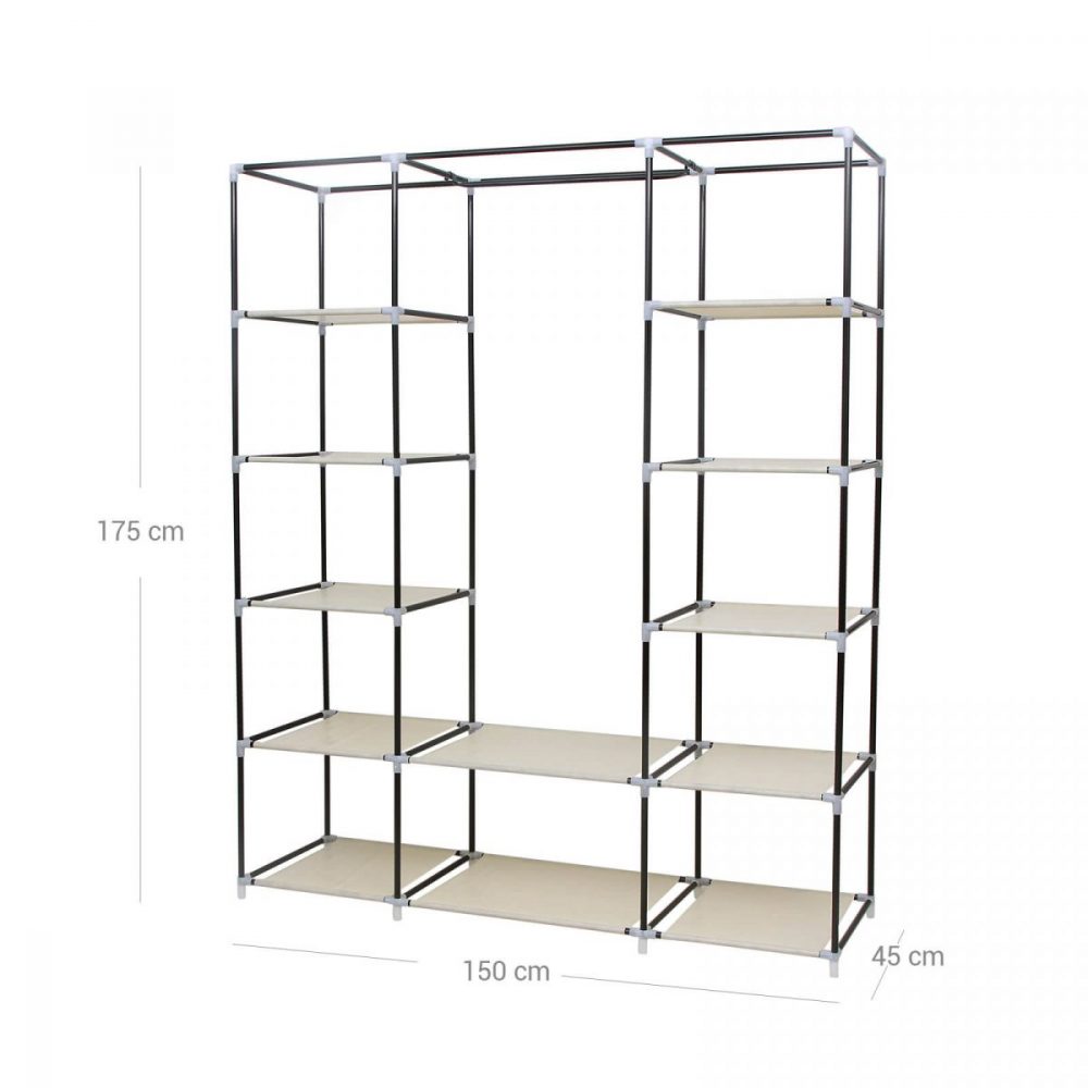 Con dimensiones de 150 x 45 x 175 cm, este armario ofrece una solución amplia para almacenar desde ropa de temporada hasta accesorios diarios. Cada estante soporta hasta 5 kg, mientras que la barra para colgar es capaz de sostener hasta 25 kg, distribuyendo el peso de manera uniforme.