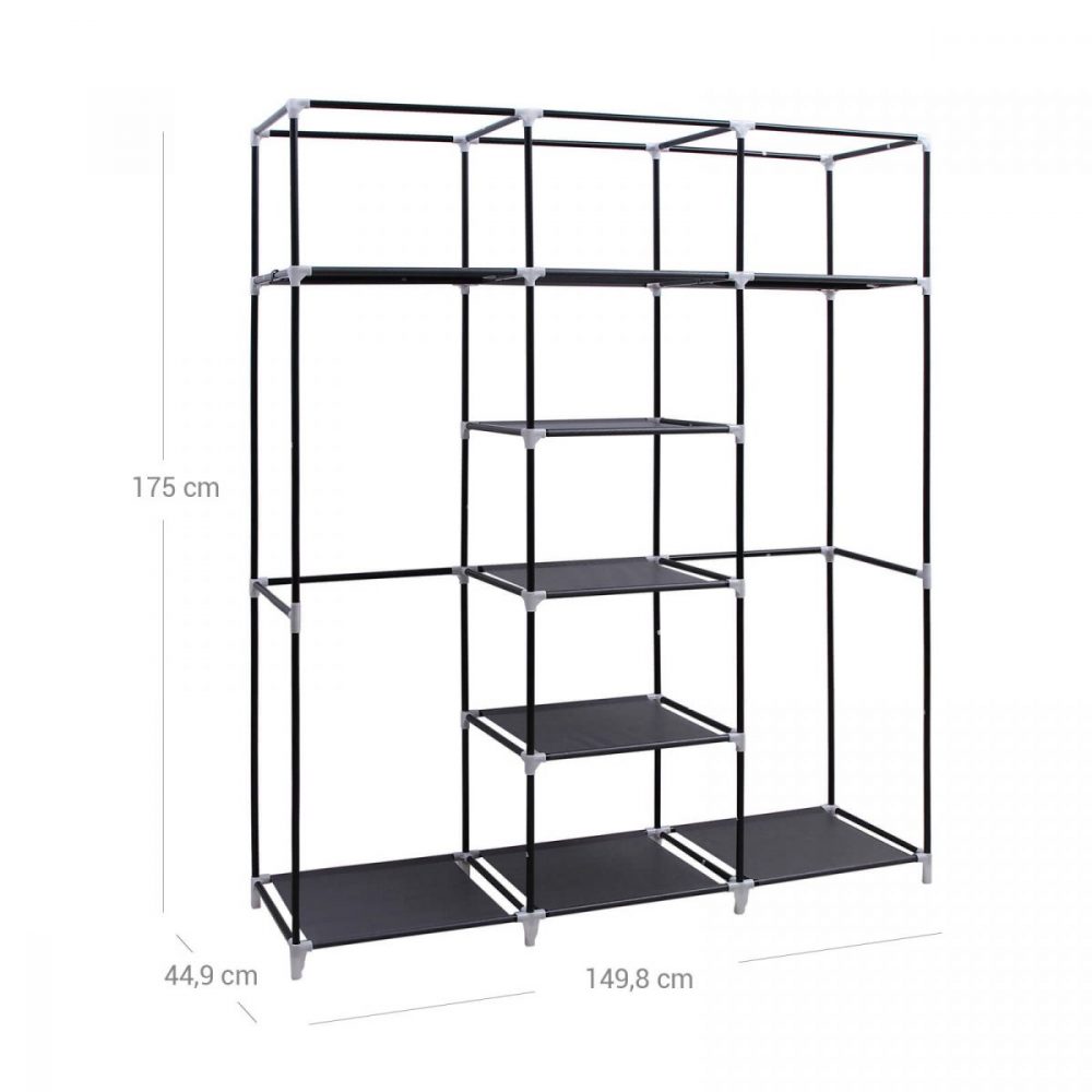 La estructura está compuesta por tubos de acero y uniones de plástico de alta calidad que ofrecen una gran estabilidad. Cada estante puede soportar hasta 5 kg cuando el peso se distribuye uniformemente, y la barra para colgar la ropa puede soportar hasta 15 kg.