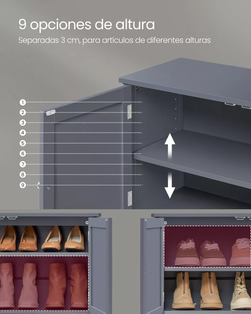 Estantes Ajustables: El mueble incluye un estante superior con 9 orificios de ajuste separados por 3 cm, permitiendo personalizar la altura según el tipo de calzado, desde zapatillas y sandalias hasta tacones y botines.
