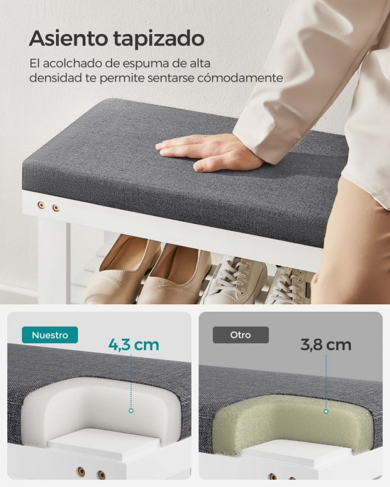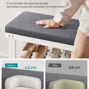 Este banco zapatero no es solo un mueble práctico, sino también un elemento cómodo y elegante para tu hogar. Olvídate de los incómodos taburetes y disfruta de la comodidad de este banco con un acolchado de 4,3 cm de grosor, ideal para sentarte mientras te cambias los zapatos.