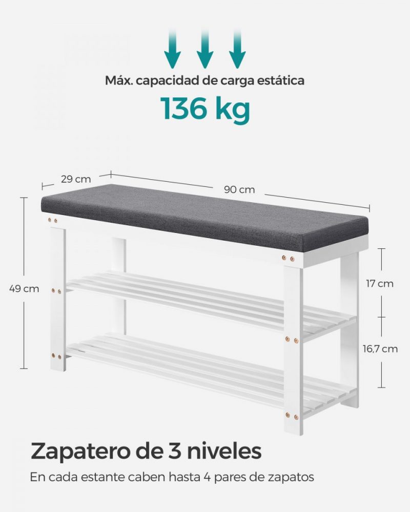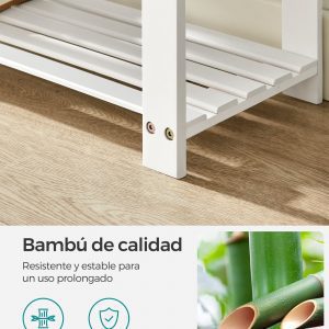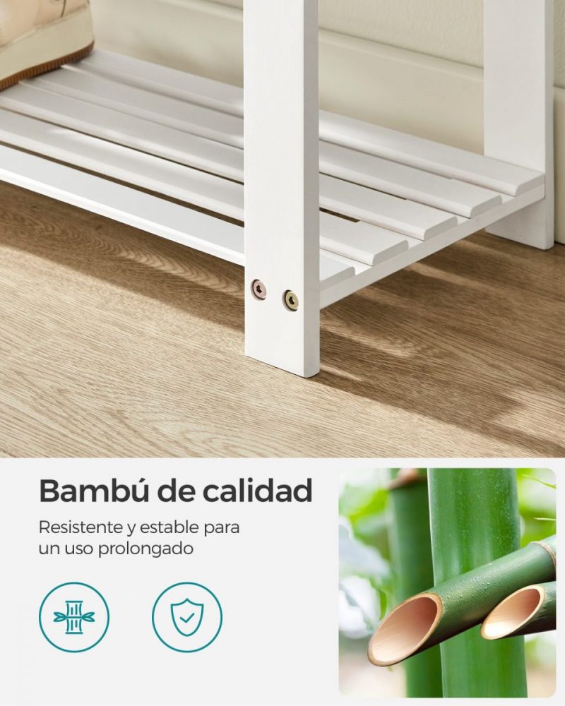 El banco está diseñado con un marco de bambú resistente, conectado por tornillos 2 en 1, lo que garantiza una gran estabilidad y una alta capacidad de carga. Soporta hasta 136 kg en el asiento y 20 kg en cada estante.