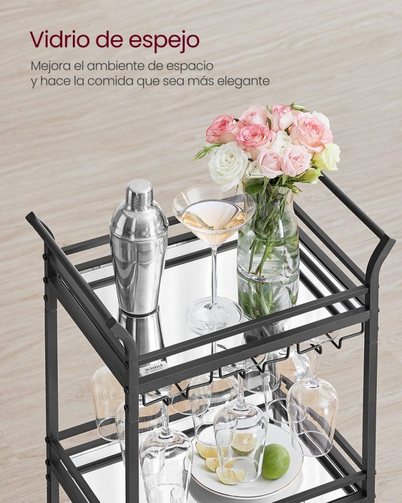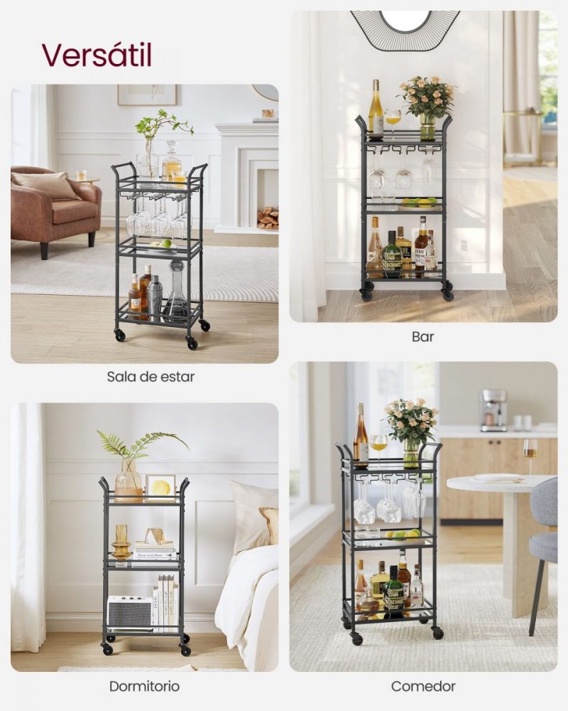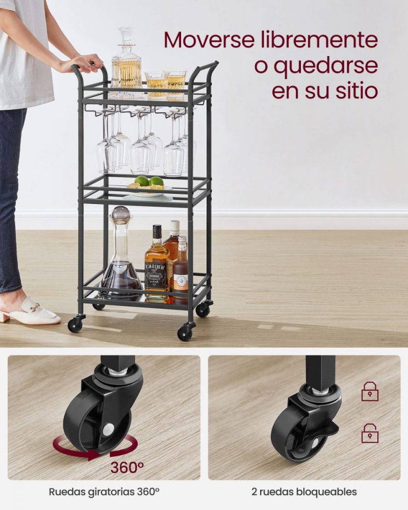 Este carro de bebidas es perfecto para quienes buscan una solución de almacenamiento y exhibición elegante y funcional. Su diseño sofisticado lo convierte en una pieza destacada en cualquier reunión o evento, aportando un toque de estilo y practicidad a tu hogar.