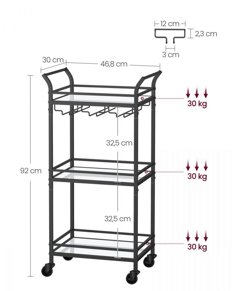 Diseño Compacto para Espacios Reducidos: Con medidas de 30 x 46,8 x 92 cm, este carro aprovecha al máximo los espacios pequeños, ofreciendo una solución de almacenamiento óptima.