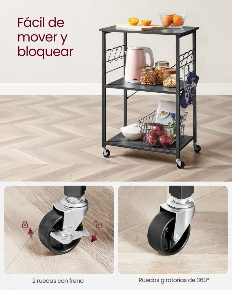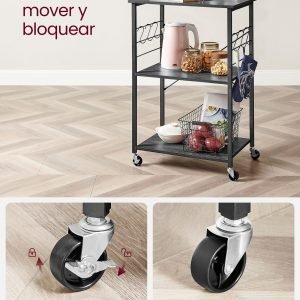Movilidad sin Esfuerzo: Equipada con 4 ruedas universales, de las cuales 2 cuentan con freno, esta estantería se puede mover fácilmente a cualquier parte de tu cocina. La flexibilidad de detenerla en cualquier lugar permite una cocina más dinámica y adaptativa.