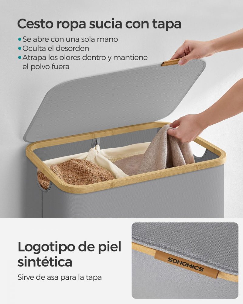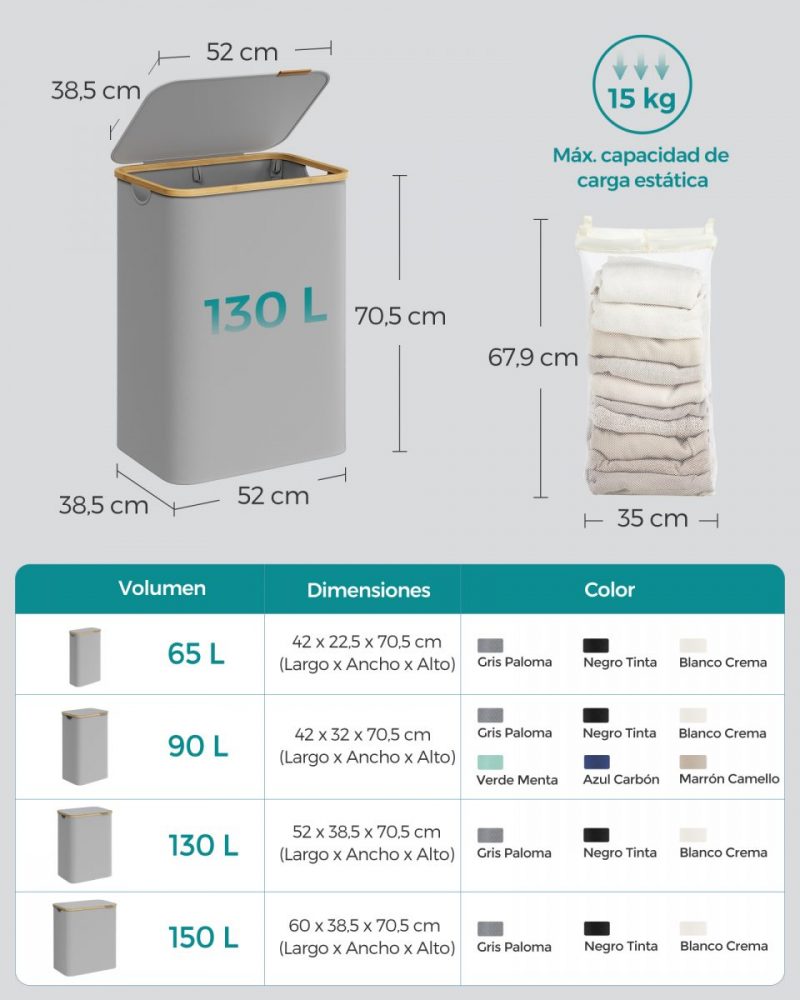 2 Amplios Compartimentos: Este cesto para ropa sucia cuenta con dos compartimentos espaciosos, con un total de 130 litros de capacidad. Con dimensiones de 52 x 38,5 x 70,5 cm, está diseñado para facilitar la clasificación y almacenamiento de la ropa de una familia, ayudándote a mantener todo organizado y listo para lavar.