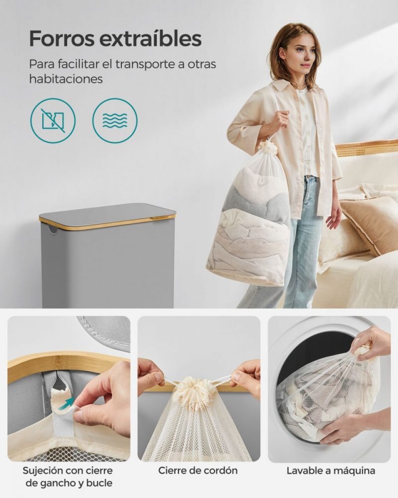Forros Extraíbles y Versátiles: Los forros internos, sujetos con cierres de ganchos y bucles, se pueden quitar fácilmente. Gracias a sus cordones, se pueden transportar cómodamente, y su diseño de malla permite utilizarlos como bolsas de lavado directo para la lavadora, manteniendo la ropa organizada durante el lavado.