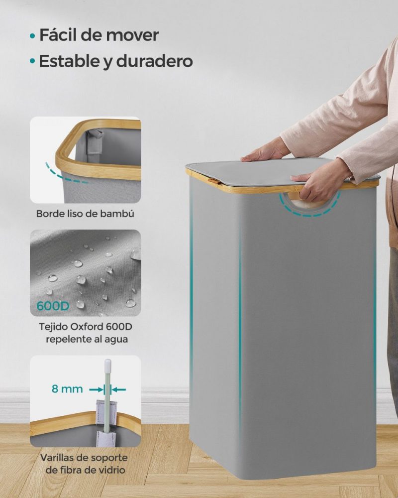Duradero y Estable: Fabricado con tejido Oxford 600D, este cesto para ropa es resistente al agua y a los desgarros, lo que lo hace fácil de limpiar y mantener. Su estructura reforzada con varillas de fibra de vidrio asegura una gran estabilidad, incluso cuando está completamente lleno.