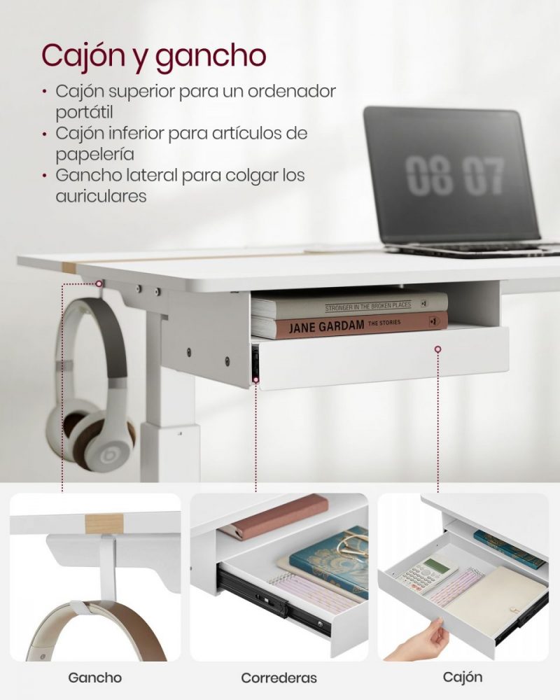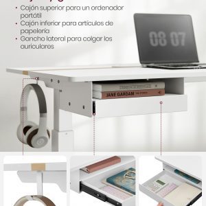 Maximiza tu espacio con un cajón conveniente para almacenar materiales de oficina y un gancho lateral para tus auriculares. La versatilidad se extiende con la opción de cambiar las patas ajustables por ruedas con freno, ofreciendo estabilidad y movilidad según sea necesario.
