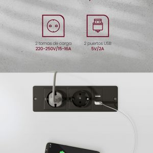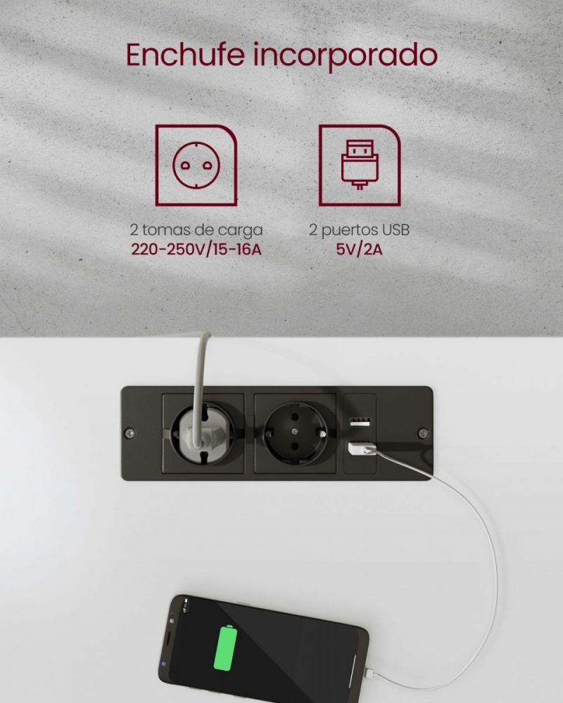 Equipado con 2 enchufes y 2 puertos USB, este escritorio te permite cargar todos tus dispositivos esenciales sin el desorden de cables adicionales. El sistema de cableado integrado asegura una configuración limpia y ordenada, manteniendo tu área de trabajo despejada y organizada.