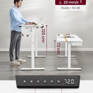 Ajusta tu escritorio a la altura perfecta con un movimiento fluido y silencioso (< 50 dB), variando entre 72 y 120 cm. La incorporación de 4 memorias de altura predefinidas permite cambiar rápidamente entre tus posiciones favoritas de trabajo, optimizando tu comodidad y eficiencia durante el día.