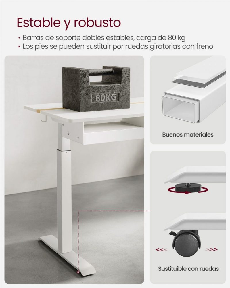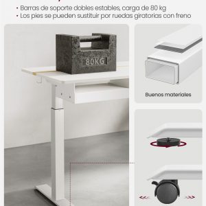Construido para durar, este escritorio cuenta con una estructura de acero reforzado y barras de soporte dobles, capaz de soportar hasta 80 kg. Las patas ajustables y las ruedas opcionales con freno proporcionan una base firme y estable, asegurando la seguridad de tus dispositivos y documentos importantes.
