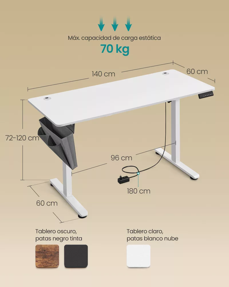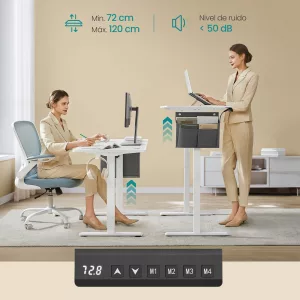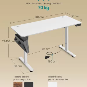 Sólido y Estable: Fabricado con un marco de acero y un tablero de aglomerado resistente, este escritorio soporta hasta 70 kg, ofreciendo un espacio de trabajo firme y confiable, incluso cuando está ajustado a la altura máxima de 120 cm.