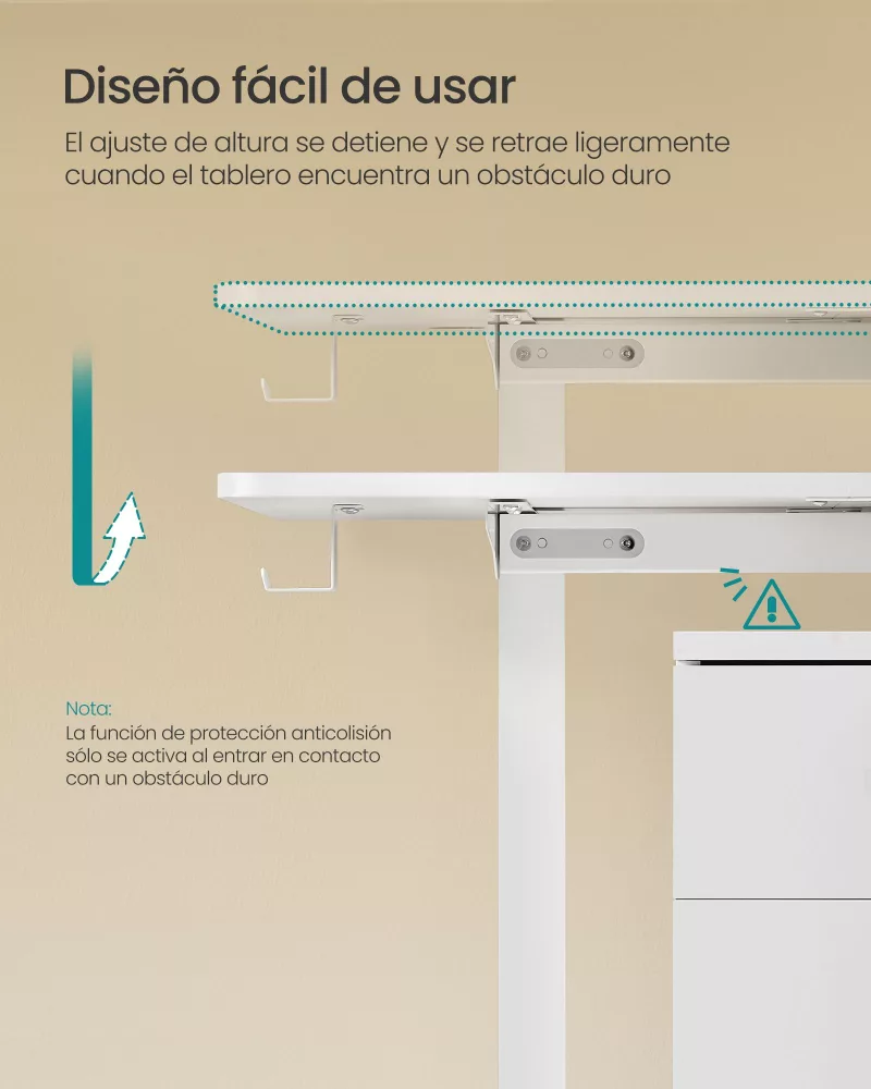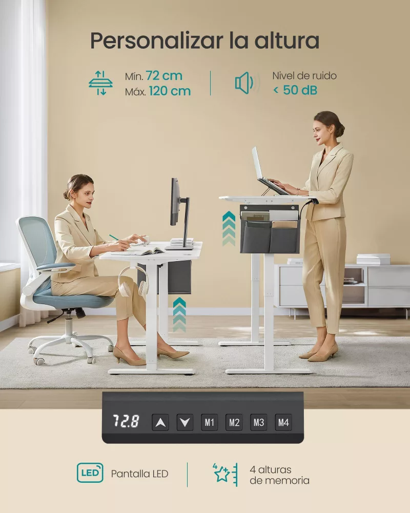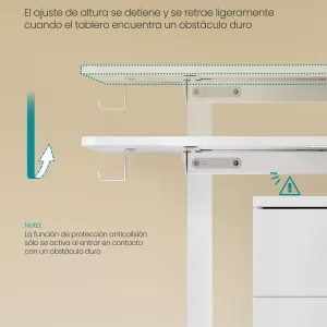 Ajuste de Altura Flexible y Seguro: Ajusta fácilmente la altura del escritorio entre 72-120 cm y guarda hasta 4 alturas preferidas para un acceso rápido. El escritorio también cuenta con una función de seguridad que detiene el ajuste si detecta un obstáculo, evitando daños o accidentes.
