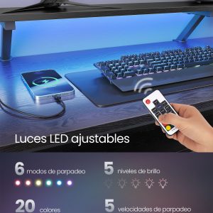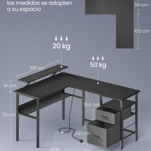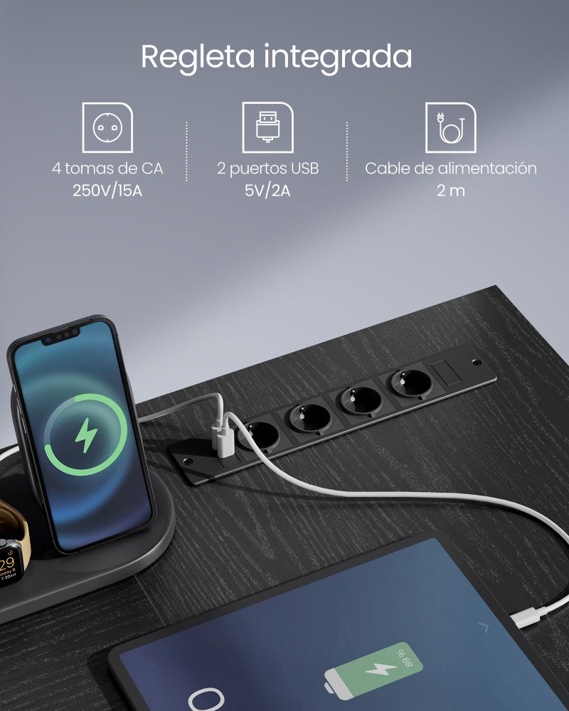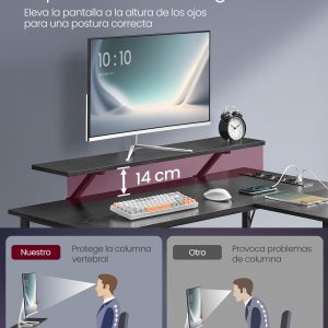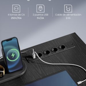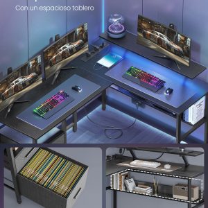 Escritorio en forma de l con tomas de corriente y led, negro