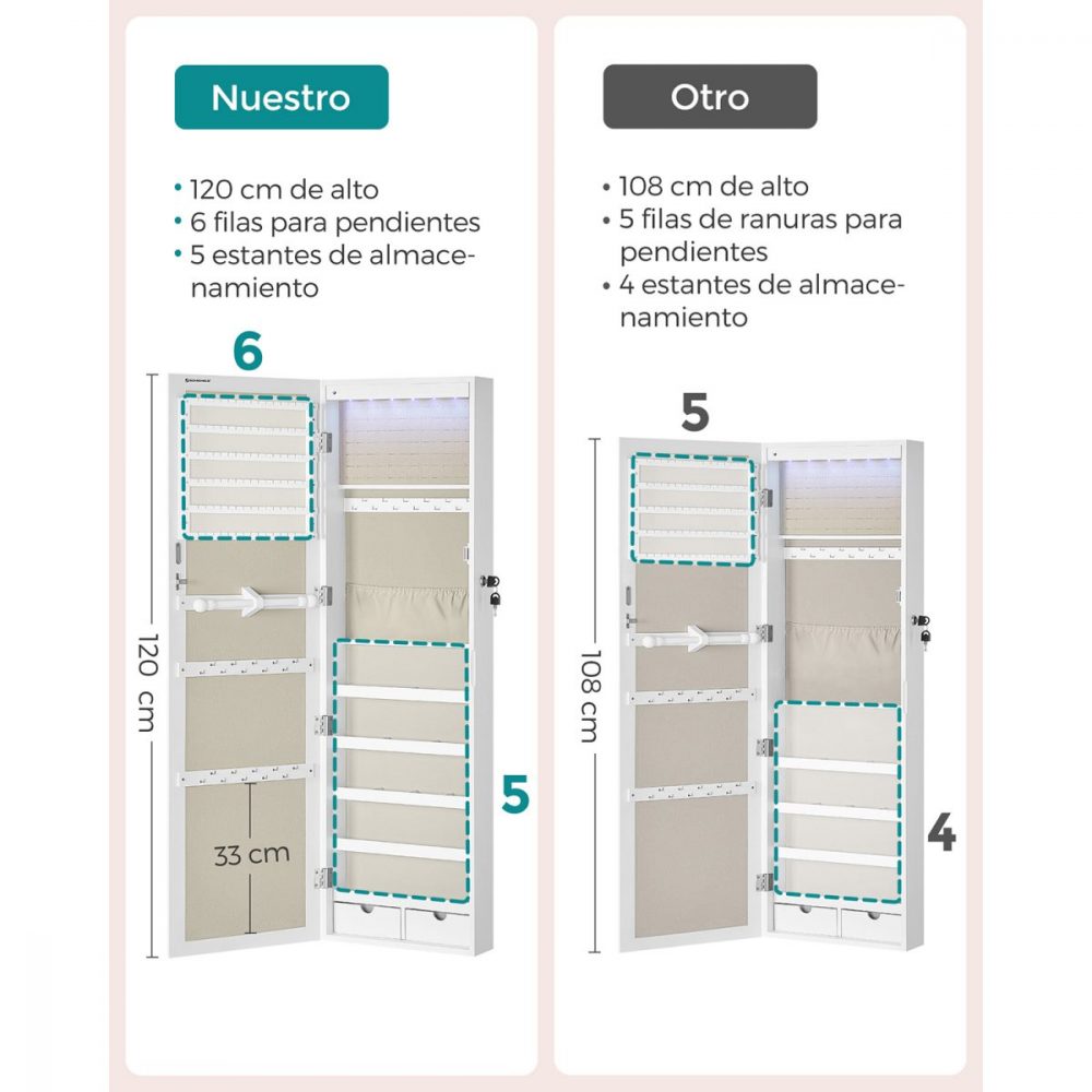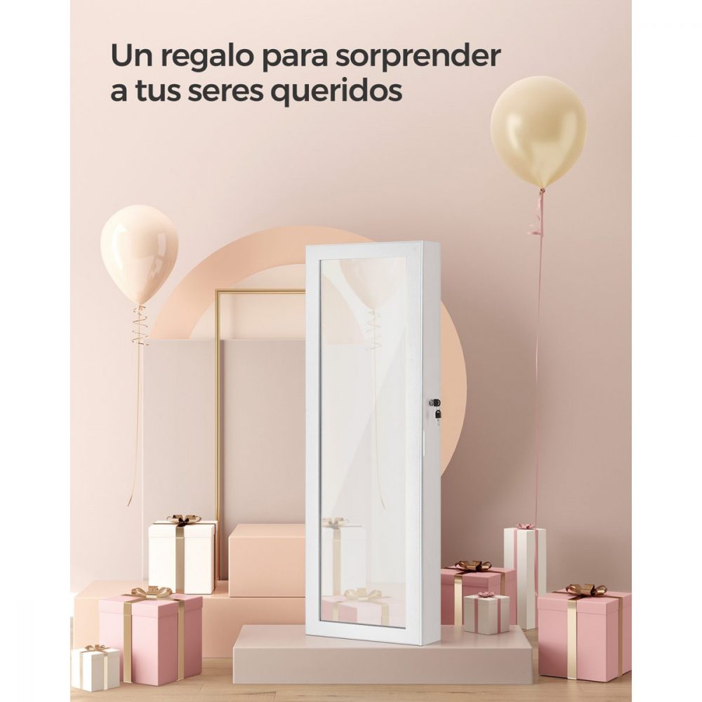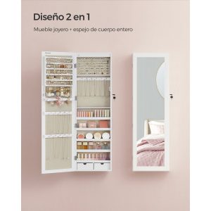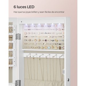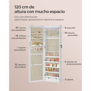 Espejo joyero con armario y luz led, montaje puerta o pared, blanco