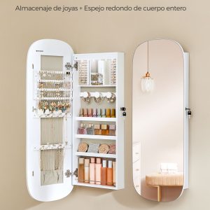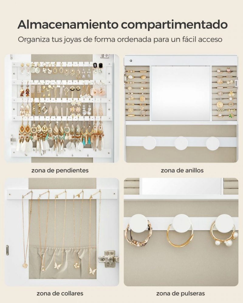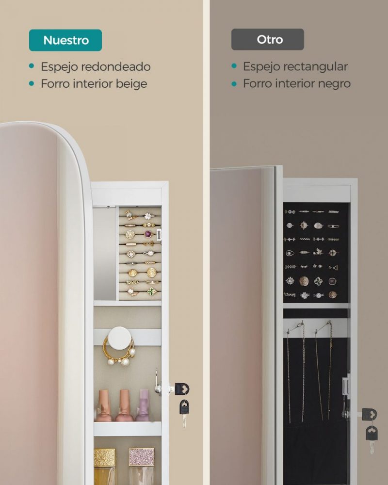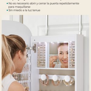 Espejo y Luz Incorporados: El espejo incorporado dentro del armario es ideal para maquillarte o para ajustes de último minuto en tus joyas. Además, la luz LED incorporada asegura una visibilidad óptima incluso en condiciones de poca luz, lo que hace que sea más fácil encontrar y seleccionar tus accesorios.