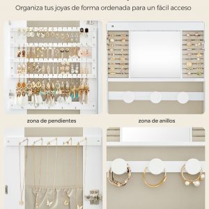 Gran Capacidad y Almacenamiento Separado: Este armario está diseñado para almacenar de manera organizada una gran variedad de joyas y accesorios. Cuenta con espacios dedicados para pendientes, collares, anillos, pulseras, y herramientas de maquillaje, asegurando que cada pieza tenga su lugar.