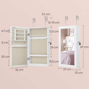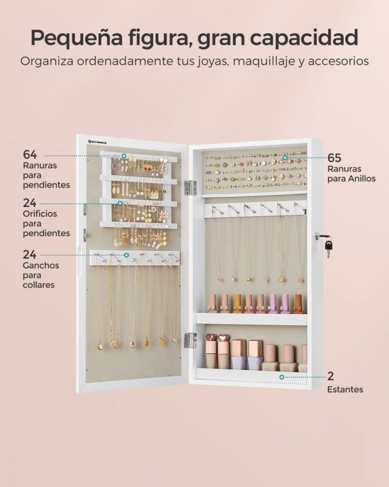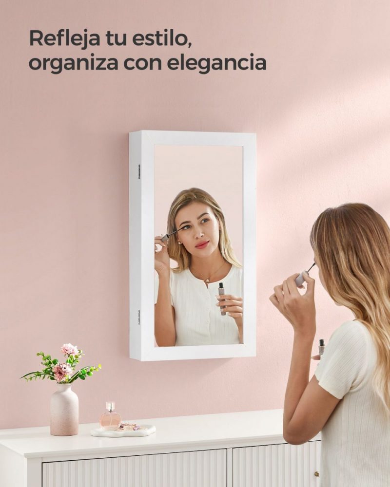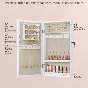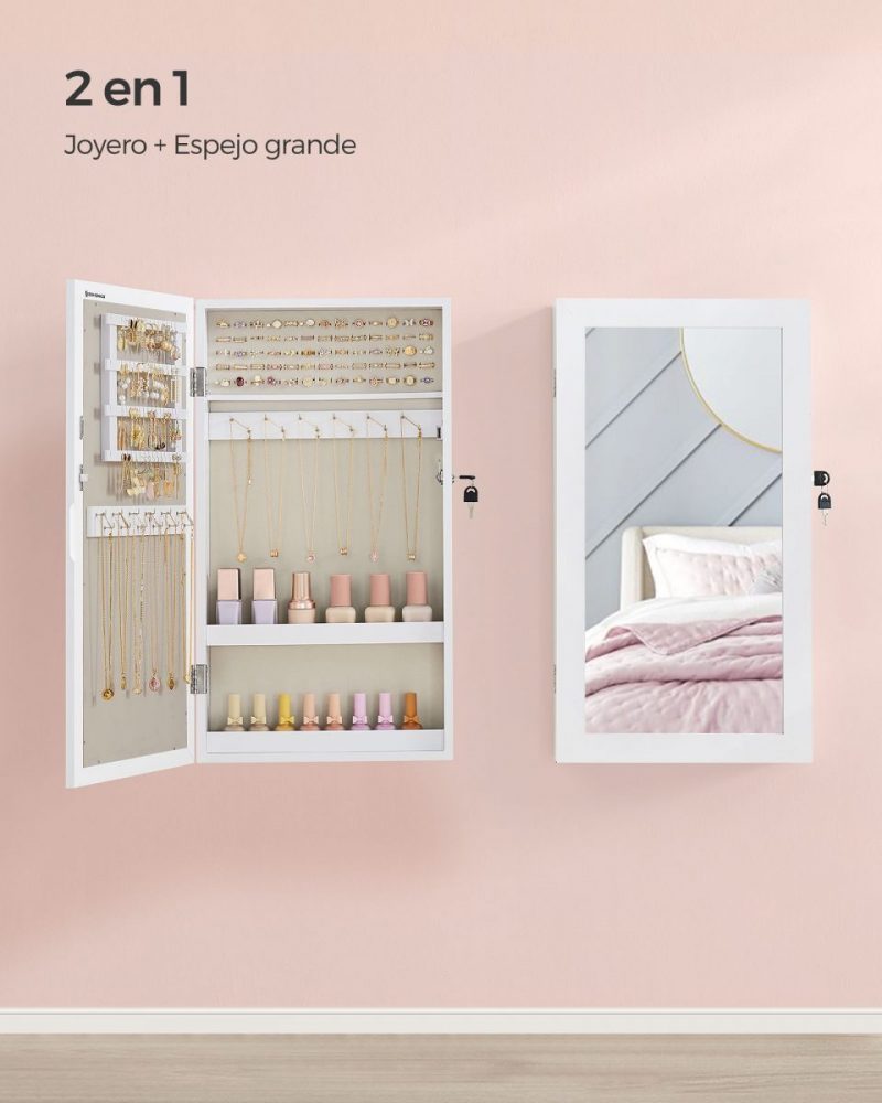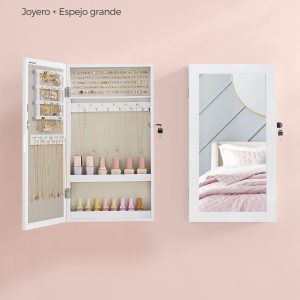 Dile adiós a los días de buscar un espejo después de elegir tus accesorios. Con nuestro organizador de joyas 2 en 1, tendrás tanto un amplio espacio para almacenar tus joyas como un espejo de puerta completo para verificar tu look en un solo paso. Esta funcionalidad dual asegura una preparación más rápida y eficiente cada día.