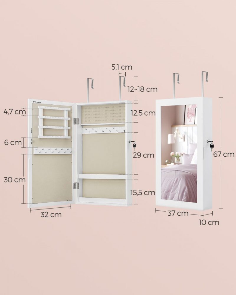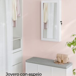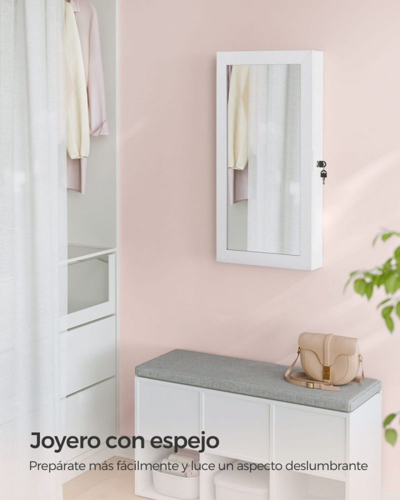 Fabricado con MDF de alta calidad, espejo de vidrio y forro de terciopelo, este gabinete está construido para ofrecer no solo un almacenamiento seguro para tus joyas sino también para garantizar la durabilidad y resistencia a lo largo de los años. Su diseño robusto puede soportar hasta 5,4 kg, asegurando que tus joyas estén seguras y protegidas.