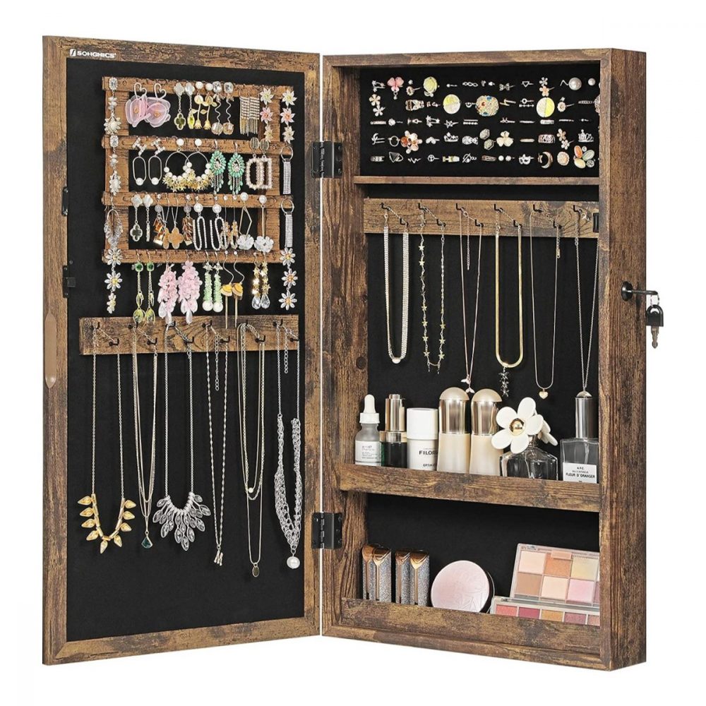 Dile adiós a los días de buscar un espejo después de elegir tus accesorios. Con nuestro organizador de joyas 2 en 1, tendrás tanto un amplio espacio para almacenar tus joyas como un espejo de puerta completo para verificar tu look en un solo paso. Esta funcionalidad dual asegura una preparación más rápida y eficiente cada día.