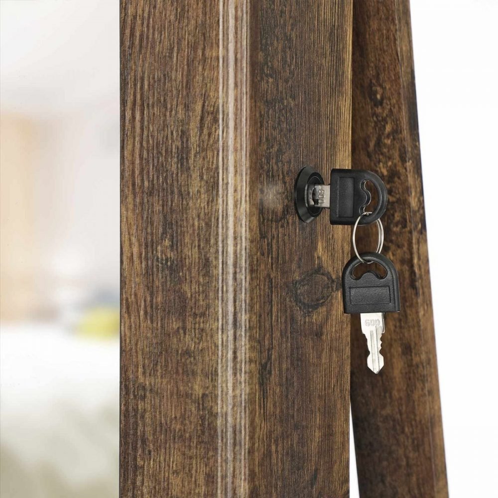 Construcción Segura y Duradera: Hecho de MDF de alta calidad con un diseño bloqueable, este organizador de joyas garantiza la seguridad de tus preciadas piezas. La puerta del armario cierra herméticamente gracias a un imán incorporado, ofreciendo tranquilidad.