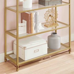 Versatilidad en Cada Rincón: Esta estantería es tan versátil como tus necesidades. Úsala para decorar tu salón, organizar documentos en la oficina, almacenar cestas en el dormitorio, organizar utensilios en la cocina o incluso guardar productos de ducha en el cuarto de baño. El vidrio hidrófugo y el metal con recubrimiento en polvo antioxidante la hacen adecuada para cualquier entorno.