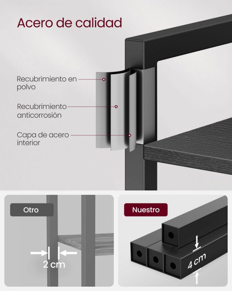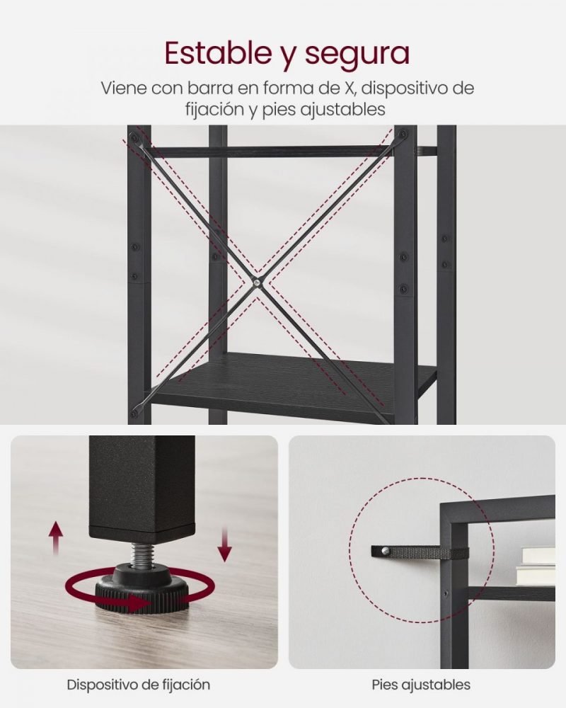 La estabilidad es clave en cualquier mueble, y esta librería lo tiene todo. Equipada con patas ajustables, se mantiene firme y recta incluso en superficies irregulares, mientras que su diseño en forma de X refuerza su capacidad para sostener hasta 50 kg. Es la combinación perfecta de belleza y fuerza, ofreciendo un soporte fiable para tu biblioteca personal.